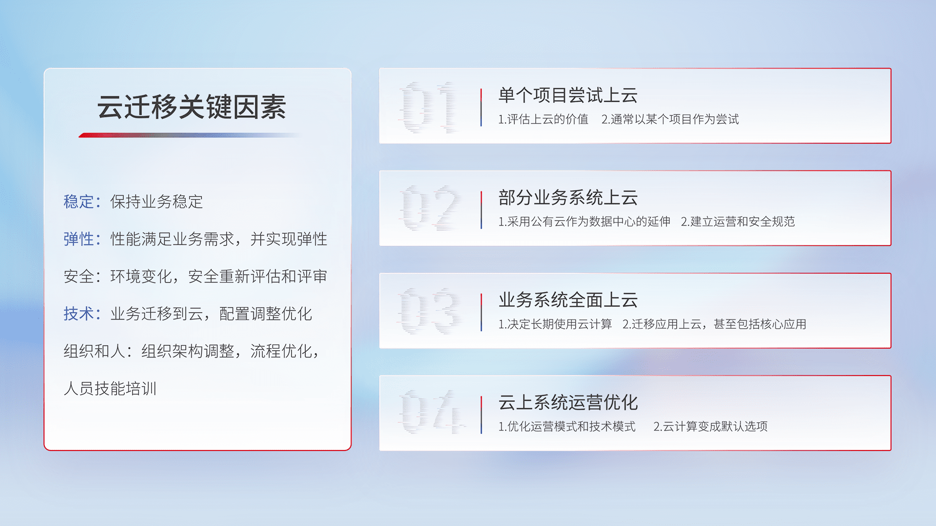 结合实际业务,,从规划设计、、云平台选型、、、、云原生改造、、、、数据迁移、、、、集成交付,,,迁移全过程为客户识别最佳上云路径,,,,做好风险识别管理,,,,设计网络架构、、、身份权限、、、、安全审计合规、、操作审计、、、日志审计、、监控告警策略、、多站点容灾设计等,,,,对云上基础设施进行整体规划,,提升IT治理水平,,以满足弹性、、、高可用、、高性能的需求。。