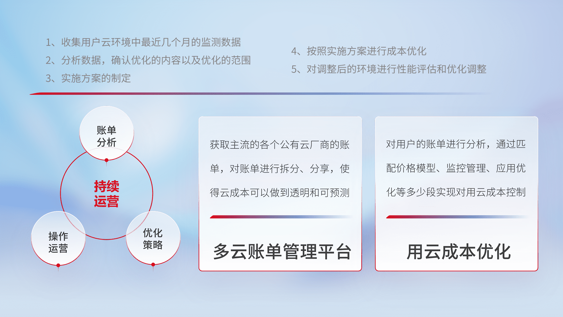 通过多云纳管,,,以统一的资源数据模型把客户的云资源进行抽象和封装,,进而实现对多云资源的统一操作,,,保障云资源管理的可靠性、、稳定性与可用性。。量身定制化运维内容,,,,配置、、开发运维、、、、补丁管理、、、备份、、、监控、、、认证和访问管理、、、、审计和日常巡检等,,,保障在用云过程中的可靠度,,,稳定度以及高可用率。。